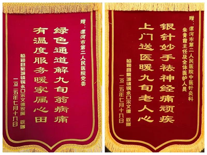 7月20日上午,市二院門診大廳暖意融融,92歲宋老先生的家屬手捧兩面錦旗,專程向醫(yī)院黨委和中醫(yī)針灸科表達(dá)最誠摯的謝意。副院長劉橋受院黨委委托與全國先進(jìn)工作者、全國“五一”勞動獎?wù)芦@得者、中醫(yī)針灸科主任朱青霞及科室團(tuán)隊熱情接待了家屬,并鄭重接過了這份沉甸甸的心意。
