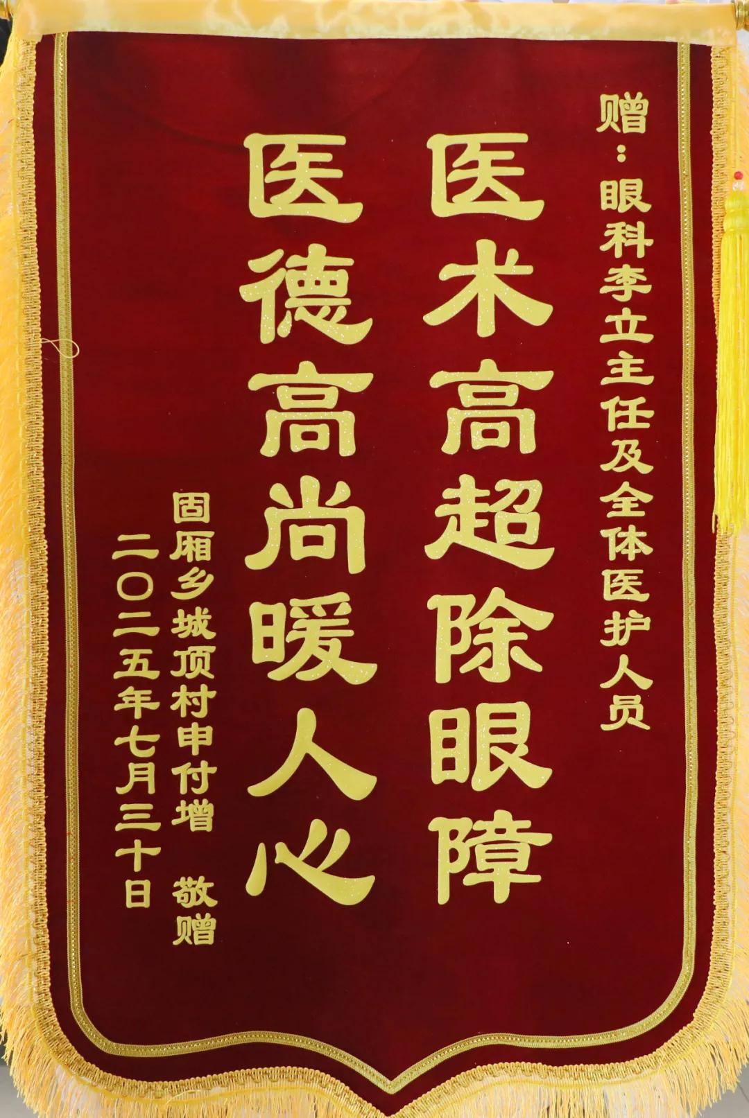 7月30日上午,臨潁縣固廂鄉(xiāng)城頂村黨支部書(shū)記楊勝武和該村申大爺家屬滿面笑容地將一面寫(xiě)著“醫(yī)術(shù)高超除眼障,醫(yī)德高尚暖人心”的錦旗送到了市二院眼科病區(qū)。