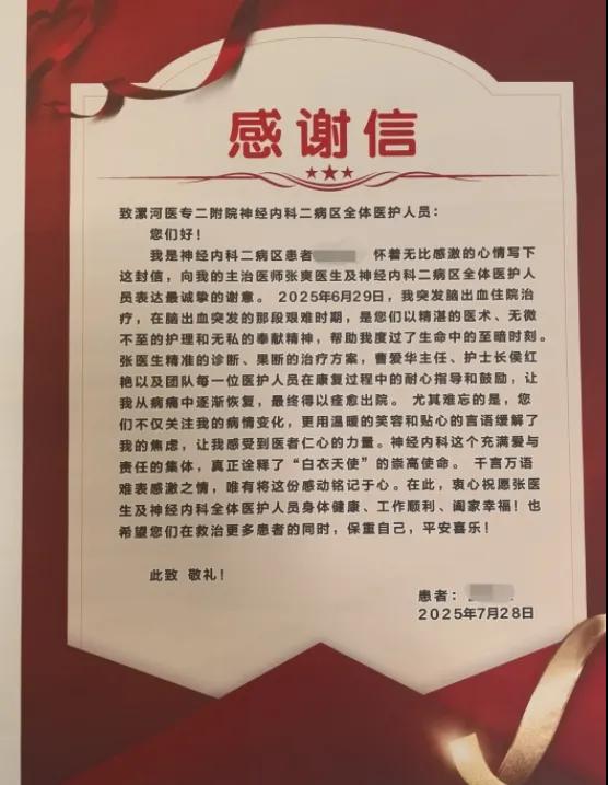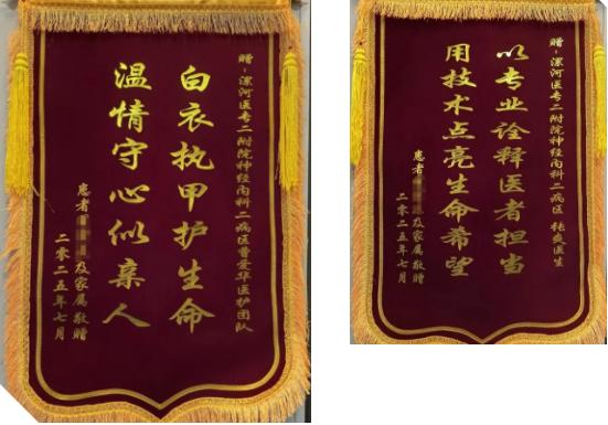 “你們不僅關(guān)注我的病情變化,更用溫暖的笑容和貼心的言語緩解了我的焦慮,讓我感受到醫(yī)者仁心的力量。”康復(fù)出院后,患者及家屬攜錦旗與感謝信再次來到醫(yī)院,他們把“以專業(yè)詮釋醫(yī)者擔(dān)當(dāng) 用技術(shù)點亮生命希望”、“白衣執(zhí)甲護生命 溫情守心似親人”這樣的贊譽送給醫(yī)護人員,表達著對醫(yī)護團隊的認可,也彰顯了醫(yī)院多學(xué)科聯(lián)合會診機制,院前急救、院內(nèi)急診、院內(nèi)救治全流程閉環(huán)管理的顯著優(yōu)勢。