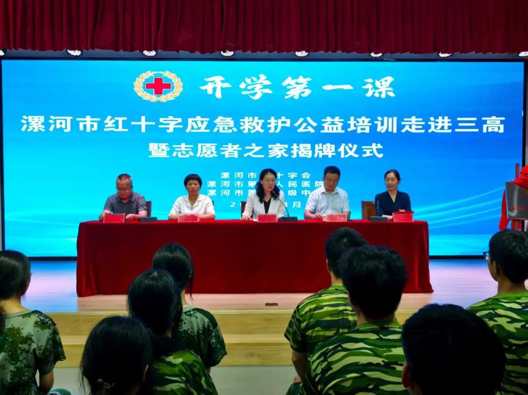 現(xiàn)場,郭俊偉向“漯河市第三高級中學(xué)紅十字應(yīng)急救護社團”代表授旗,孫潁華和胡海英共同為“紅十字志愿者之家”揭牌。
