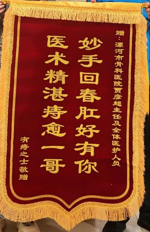 近日,漯河醫(yī)專二附院(漯河市骨科醫(yī)院、漯河市立醫(yī)院)肛腸科收到一面滿載心意的錦旗。患者握著賈彥超主任的手再三致謝,錦旗上“妙手回春肛好有你,醫(yī)術(shù)精湛痔愈一哥”十六個大字,既是對醫(yī)護人員專業(yè)能力的肯定,更是對肛腸科中西醫(yī)結(jié)合診療水平的認(rèn)可。