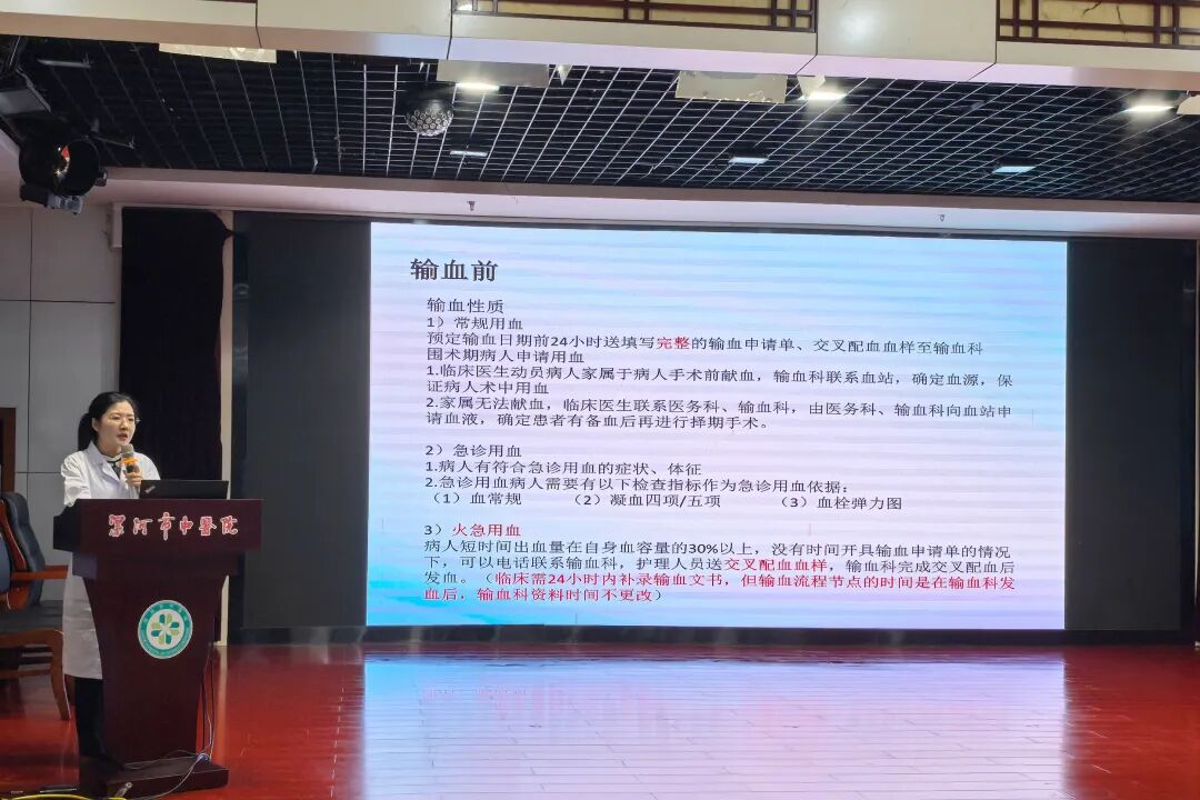 為進(jìn)一步規(guī)范臨床輸血操作流程,強(qiáng)化醫(yī)護(hù)人員輸血安全意識(shí),保障患者用血安全與醫(yī)療質(zhì)量,2025年9月12日至13日,漯河市中醫(yī)院輸血檢驗(yàn)科在四樓會(huì)議室對(duì)全院醫(yī)護(hù)人員分批開展臨床輸血專項(xiàng)培訓(xùn)。培訓(xùn)由輸血檢驗(yàn)科張丹丹講解。