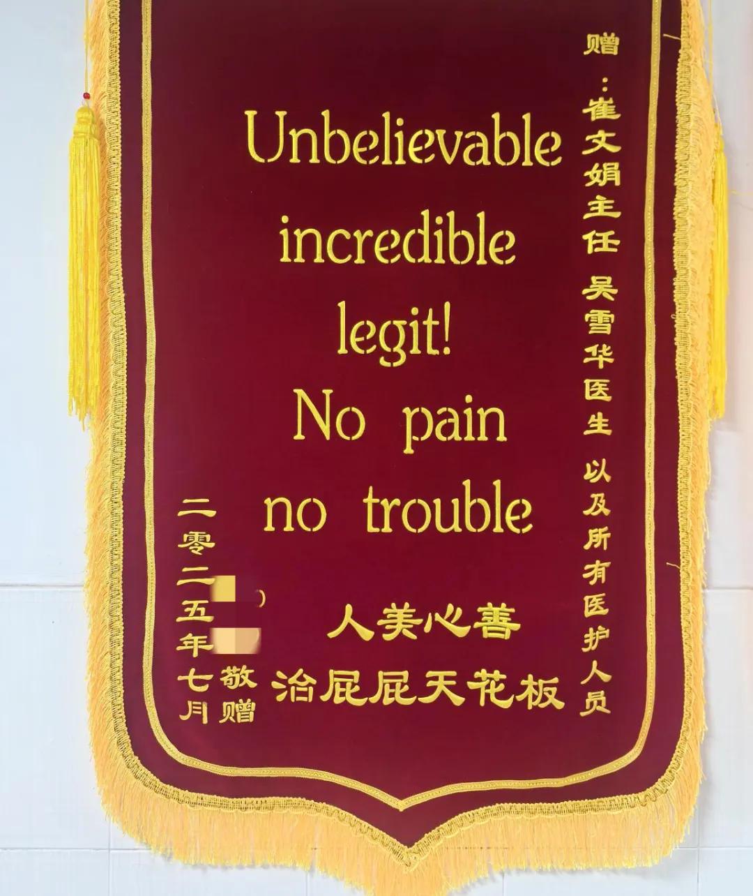 熟悉肛腸科的人都知道,這里時(shí)常因患者的 “巧思” 充滿歡樂,近期科室就接連收到了好幾面別具一格的錦旗。其中一面寫著 “Unbelievable incredible legit!No pain no trouble 人美心善 治屁屁天花板”,中西結(jié)合的表達(dá)既俏皮又真誠;還有一面則用 “手術(shù)不疼換藥不疼,肛好有你高水平!” 的諧音巧語傳遞謝意。這些充滿趣味的錦旗文字,從側(cè)面印證了肛腸科在創(chuàng)面疼痛管理方面取得了良好成效,也是患者對(duì)我們?cè)\療服務(wù)的肯定認(rèn)可。
