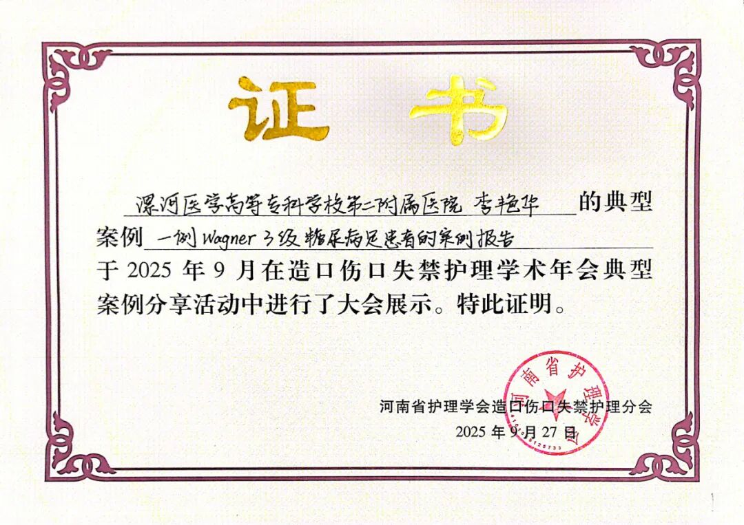 會(huì)上,漯河醫(yī)專二附院(漯河市骨科醫(yī)院、漯河市立醫(yī)院)壓力性損傷護(hù)理學(xué)組秘書(shū)、門(mén)診綜合治療室副主任護(hù)師李艷華的《一例 Wagner3級(jí)糖尿病足患者的案例報(bào)告》從全省200余例案例中脫穎而出,榮獲優(yōu)秀案例并進(jìn)行現(xiàn)場(chǎng)展示。這是她第二次獲此殊榮,充分彰顯了醫(yī)院在專科護(hù)理領(lǐng)域的深厚實(shí)力與學(xué)科建設(shè)的卓越成果。