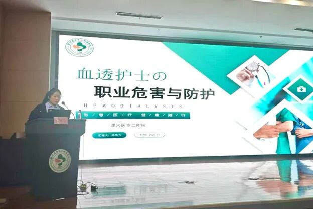 漯河醫(yī)專二附院血液凈化室骨干孫艷飛圍繞《血透護士的職業(yè)危害與防護》展開講解,從各個層面系統(tǒng)梳理了血透護士面臨的職業(yè)風(fēng)險,并提出了具體、可行的防護措施與建議,呼吁在全力關(guān)愛患者的同時,務(wù)必重視自身的職業(yè)安全與身心健康,體現(xiàn)了深刻的人文關(guān)懷精神和團隊管理智慧。由臨潁縣中醫(yī)院血液凈化室護士長陳莉與舞陽縣中醫(yī)院血液凈化室護士長張銳主持會議。