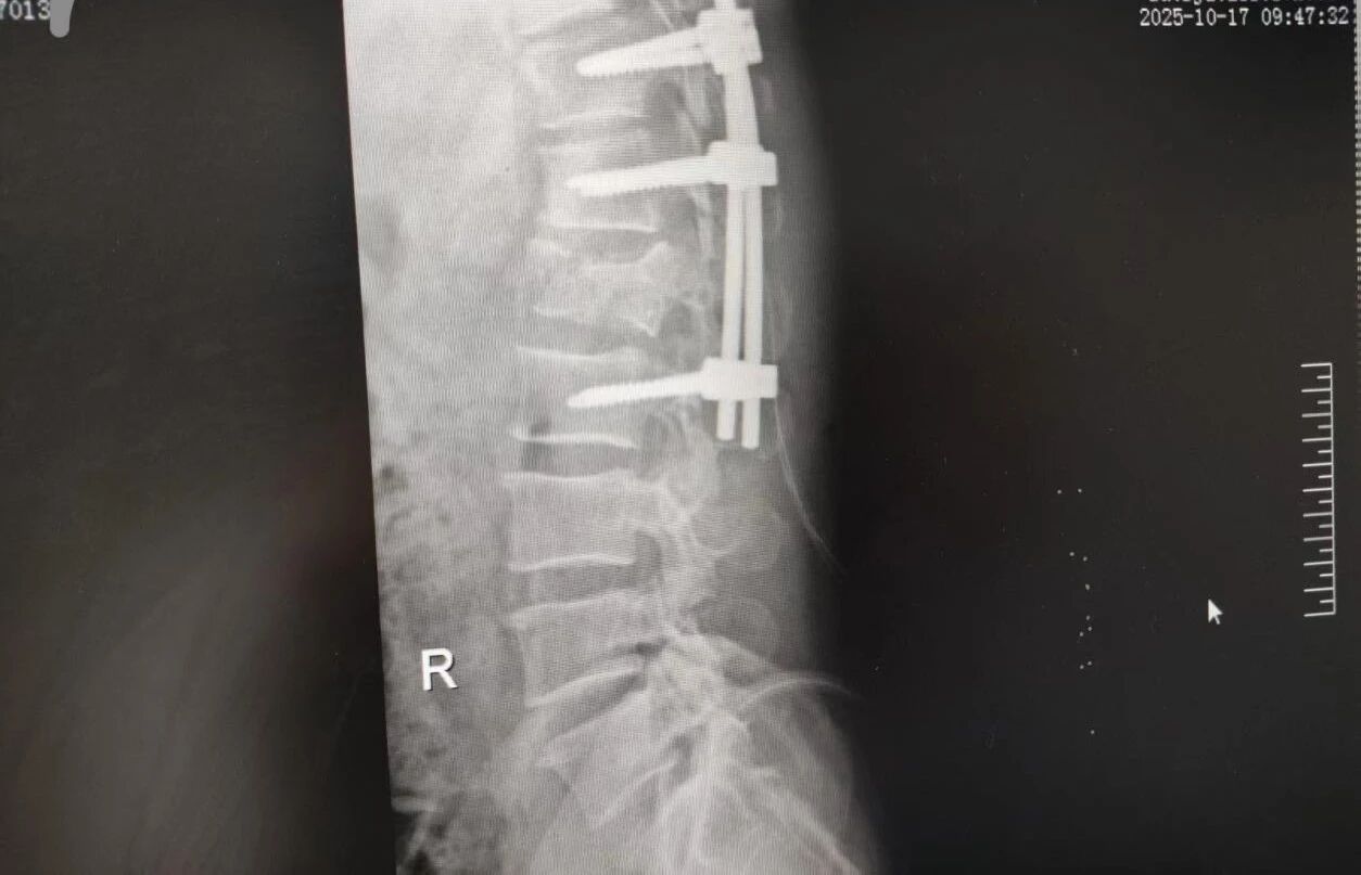 針對(duì)腰椎傷情,骨科竇志剛醫(yī)生團(tuán)隊(duì)緊急開展腰 1 椎體爆裂性骨折切開復(fù)位內(nèi)固定術(shù) + 椎板切除減壓術(shù)。手術(shù)室、麻醉科無縫銜接開通綠色通道,手術(shù)團(tuán)隊(duì)快速就位,術(shù)后患者下肢活動(dòng)恢復(fù)自如。