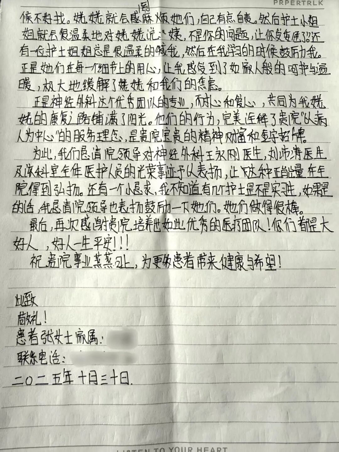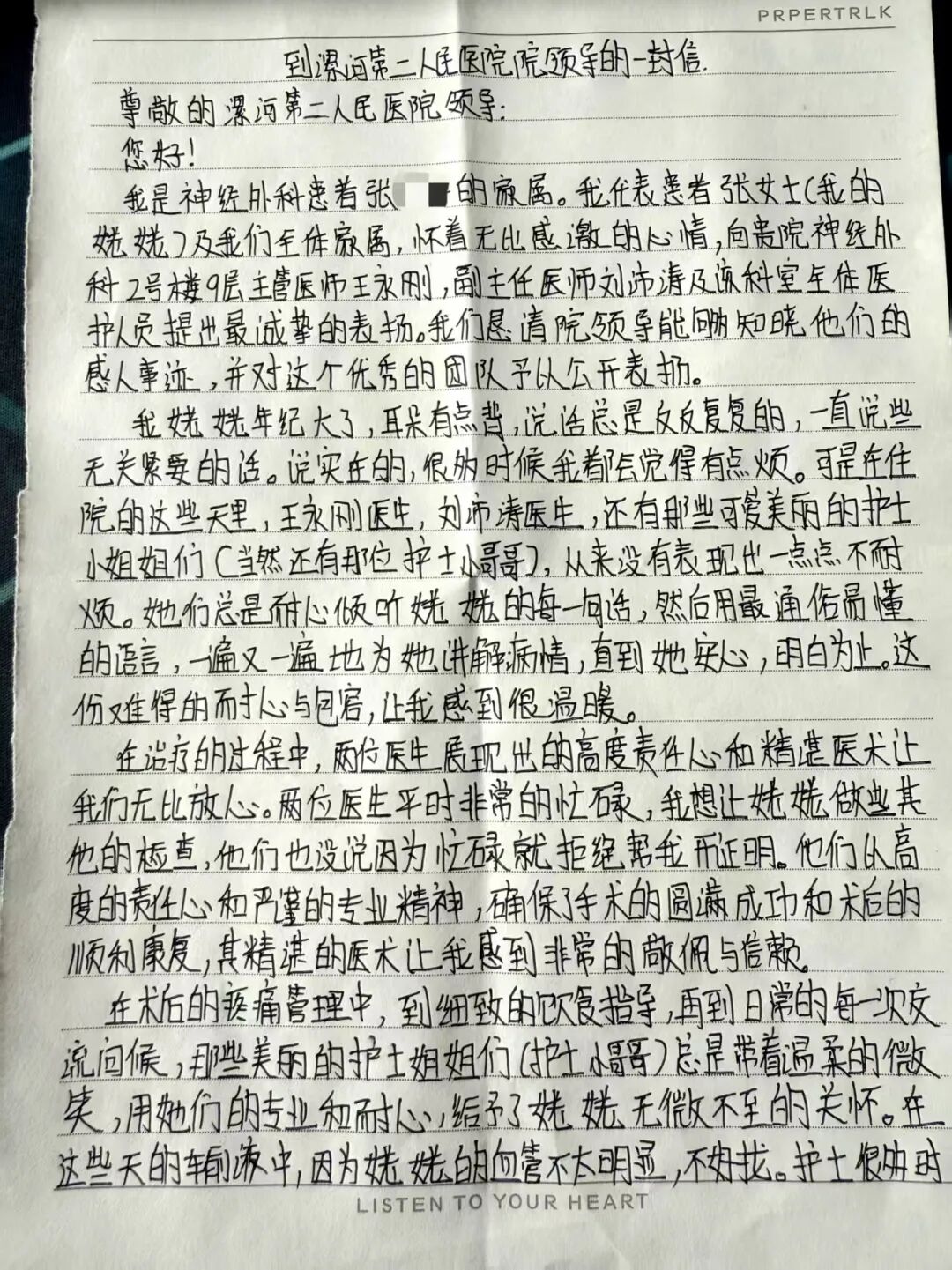 據(jù)了解,張女士的姥姥因“背部腫物”一直備受困擾,6年前在其他醫(yī)院手術治療后效果不佳,1年內(nèi)復發(fā),腫物逐漸增大,并出現(xiàn)肩部活動受限伴肩部疼痛。來到市二院后神經(jīng)外科醫(yī)生立即進行手術,因術中腫物與周圍組織粘連嚴重,手術歷時近2個小時,術后恢復良好。“我的姥姥年紀大了,耳朵有點背,說話總是反反復復,啰啰嗦嗦的。說實在的,有時候我都會覺得有點煩。可是從住院以來,劉沛濤主任、王永剛醫(yī)生,還有那些美麗可愛的護士小姐姐們和帥氣的護士小哥哥,從來沒有表現(xiàn)出一點點不耐煩。他們總是耐心地聽姥姥講,一遍遍地解釋給她聽,直到她聽懂為止。”張女士的表揚信中字里行間包含著對神經(jīng)外科整個醫(yī)護團隊暖心服務的認可與贊美。