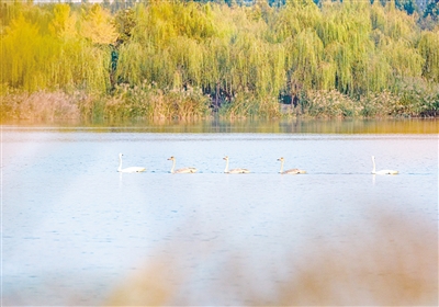天鵝的到來,讓附近的居民興奮不已,不少人在遠(yuǎn)處觀看,還拿著手機(jī)拍攝天鵝戲水的情景。陳璐介紹,2021年春天,有30多只天鵝在這里停留,今年3月有3批共27只天鵝光臨。