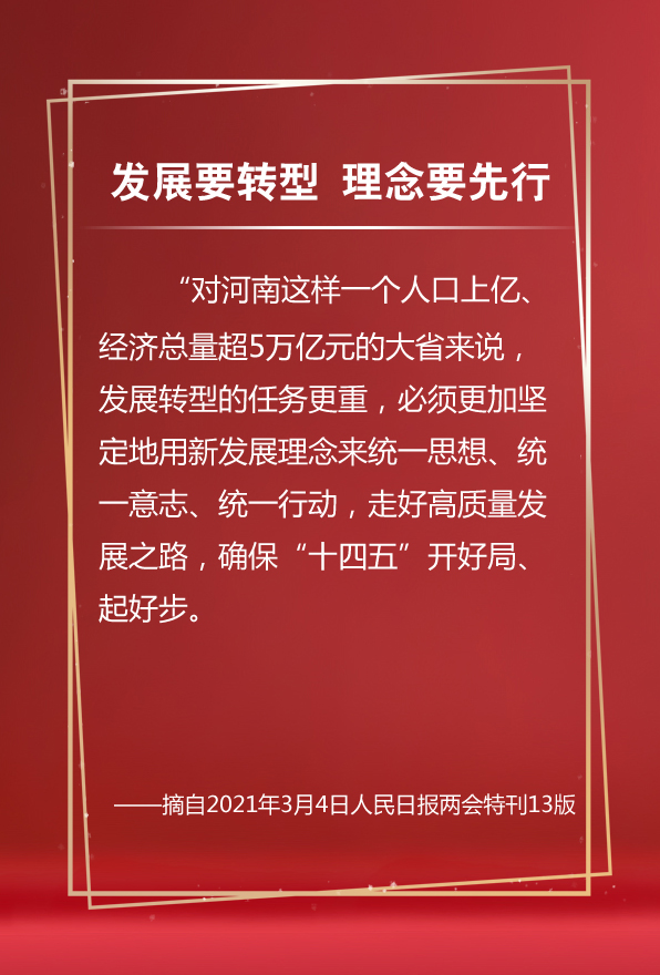 3月4日,人民日報兩會特刊刊發(fā)河南省委書記、省人大常委會主任王國生代表的“兩會聲音” ——《堅定以新發(fā)展理念引領高質量發(fā)展》,闡述了對新發(fā)展理念的四點認識,我們從中摘出其中的“點睛之筆”,解讀河南省未來發(fā)展的思路和方向。