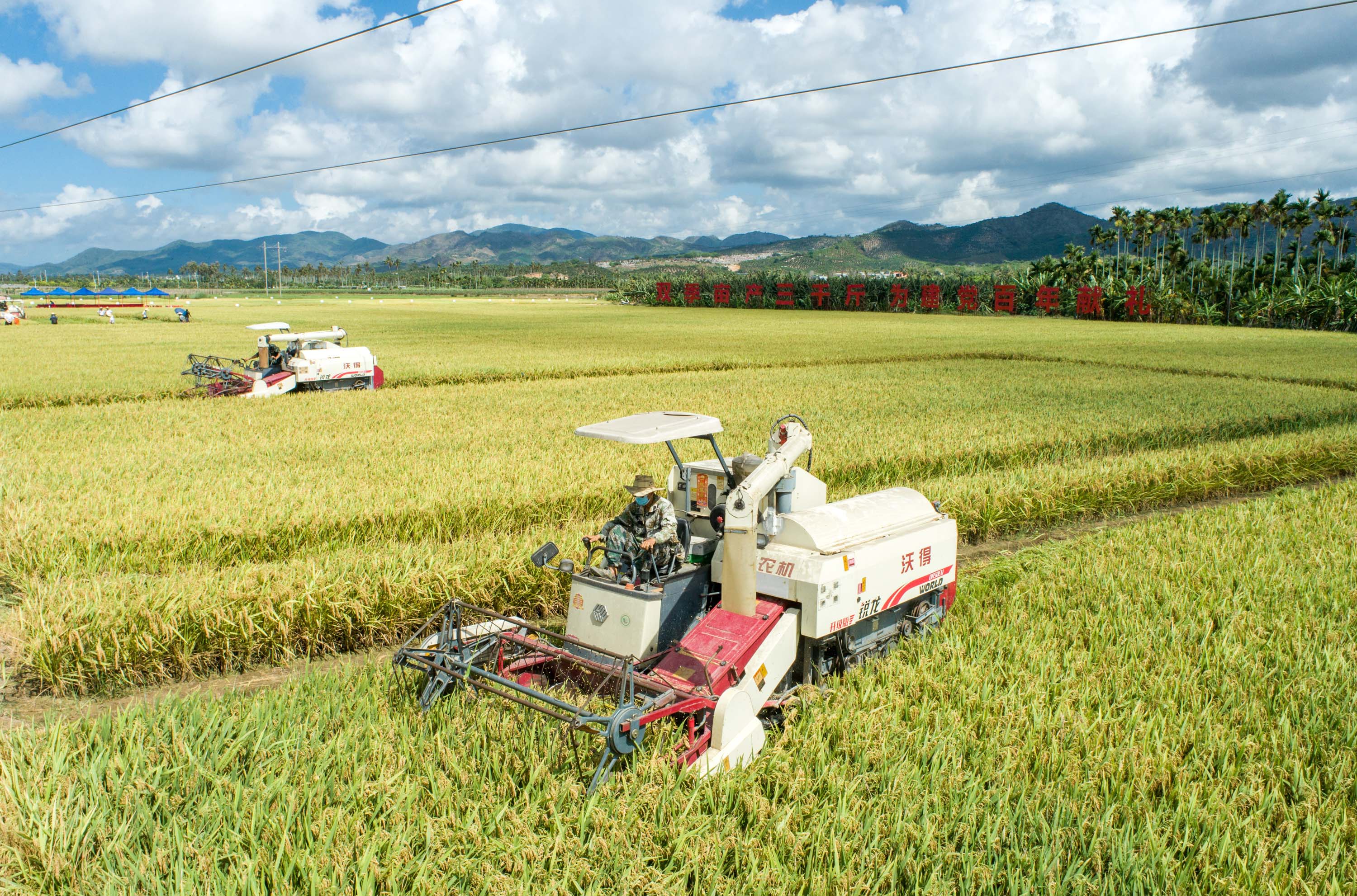 △2021年5月14日,在海南三亞市崖州區(qū)(壩頭)南繁公共試驗(yàn)基地,聯(lián)合收割機(jī)在收割“超優(yōu)千號(hào)”雜交水稻。