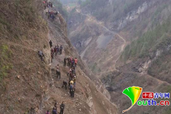 綿延不斷的深山,蜘蛛般懸掛的漢子,枯裂如松皮的雙手,沾滿泥土的鞋襪,像極了寓言故事里的“愚公移山”,這一幕真真實實地發(fā)生在湖北店子坪村的懸崖絕壁上。