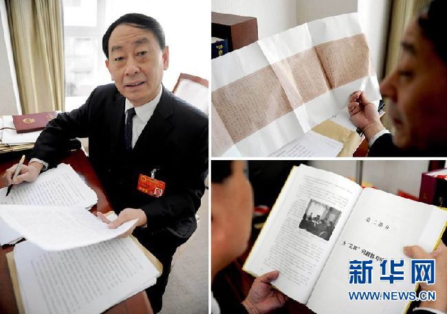 “左圖:唐祖宣在擔(dān)任全國(guó)人大代表時(shí)在駐地修改建議,他準(zhǔn)備就新型農(nóng)村合作醫(yī)療和醫(yī)藥衛(wèi)生問(wèn)題提出建議。右上:唐祖宣代表在展示寫給有關(guān)領(lǐng)導(dǎo)的關(guān)于中醫(yī)藥立法問(wèn)題的信。右下:唐祖宣代表在駐地翻閱關(guān)于三農(nóng)問(wèn)題的建議案(2008年3月4日攝)