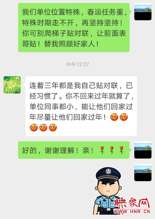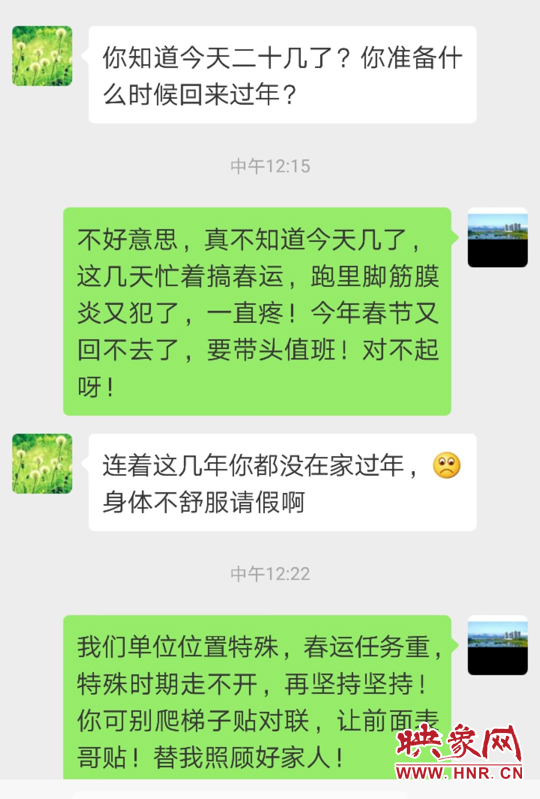 因春節(jié)值班,四年沒(méi)回家過(guò)年的西坪執(zhí)法服務(wù)站中隊(duì)長(zhǎng)陳曉勇與妻子的微信對(duì)話