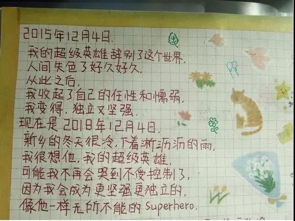 孫瑩說,其實(shí)在2014年11月,她的父親剛剛確診肺癌,治療也花了二三十萬元,“我那么努力,就想證明給爸爸看,但我的病把他嚇住了,本來他的肺癌也控制得不錯(cuò),后來腦轉(zhuǎn)移,他把錢留給我,自己放棄了治療。”2015年12月,孫瑩經(jīng)歷了父親的去世,她在日記本寫下“我的超級英雄辭別了這個(gè)世界,人間失色了好久好久,從此以后,我收起了自己的任性和懦弱,我變得獨(dú)立又堅(jiān)強(qiáng)”。
