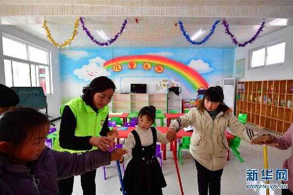在河南蘭考惠安街道辦事處范樓村,社區(qū)義工指導(dǎo)孩子們?cè)诩倨诶镒鲇螒?2019年1月23日攝)。新華社記者 馮大鵬 攝