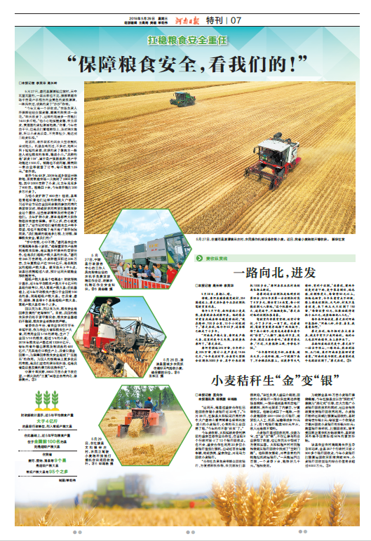 “手中有糧,心中不慌。”唐河縣農業(yè)農村局副局長楊立新說,“確保重要農產(chǎn)品特別是糧食供給,是實施鄉(xiāng)村振興的首要任務,也是我們超級產(chǎn)糧大縣的擔當。” 245萬畝耕地中小麥種植面積達到205萬畝,去年夏糧總產(chǎn)19.54億斤,是名副其實的超級產(chǎn)糧大縣。截至當天下午5點,該縣已收割超過八成,預計5月28日就能全部收割完畢。