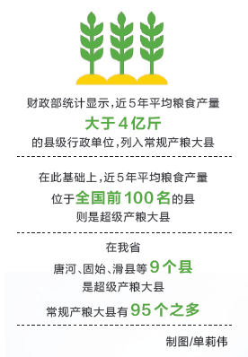 超級產(chǎn)糧大縣是個啥概念?財政部統(tǒng)計顯示,近五年平均糧食產(chǎn)量大于4億斤的縣級行政單位,列入常規(guī)產(chǎn)糧大縣;近五年平均糧食產(chǎn)量位于全國前100名的縣,則成為超級產(chǎn)糧大縣。在我省,唐河、固始、滑縣等9個縣是超級產(chǎn)糧大縣,常規(guī)產(chǎn)糧大縣更有95個之多。