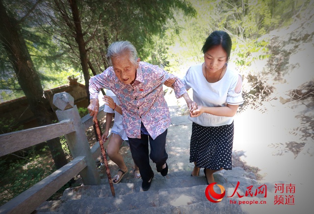 靳月英老人登山查看樹(shù)林 霍亞平 攝