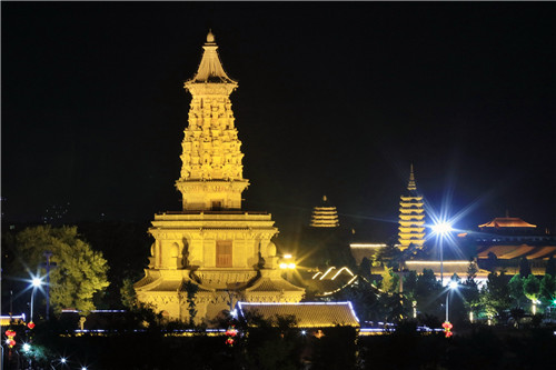 ▲正定“四塔”均建于隋唐時(shí)期,如今在燈光輝映下,雄姿依然。-河寧 攝