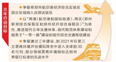 三年行動(dòng)目標(biāo)包括:到2019年年底,《中國(河南)自由貿(mào)易試驗(yàn)區(qū)總體方案》明確的改革創(chuàng)新試點(diǎn)任務(wù)具備條件的基本完成,開展一批制度創(chuàng)新試點(diǎn)項(xiàng)目并跟蹤評(píng)估試驗(yàn)成效,形成一批可復(fù)制推廣的創(chuàng)新成果,營商環(huán)境取得較大提升,在樞紐、通道、網(wǎng)絡(luò)平臺(tái)建設(shè)等方面取得突破,逐步實(shí)現(xiàn)與“一帶一路”沿線國家和地區(qū)互聯(lián)互通,基本建立與國際接軌的制度框架;鄭州片區(qū)進(jìn)出口總值達(dá)485億元以上,實(shí)際吸收外資14.5億美元以上。