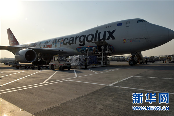 機(jī)場工作人員在新鄭國際機(jī)場卸載歐盟貨機(jī)上的商品(2017年12月7日攝)。新華社發(fā)(李嘉南 攝)