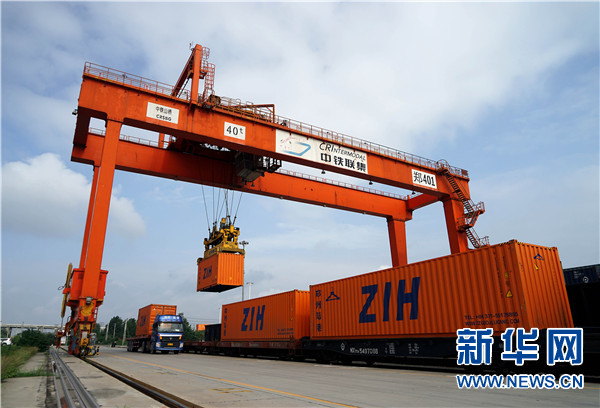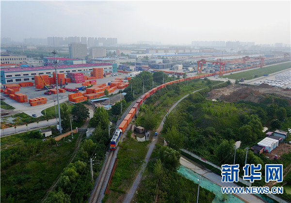 一列中歐班列(鄭州)正滿載著貨物緩緩駛出鄭州鐵路集裝箱中心站(2017年8月2日攝)。新華社記者 李安 攝