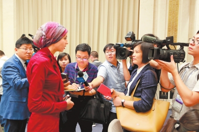 ▲中阿衛(wèi)視記者馨玥(左二)在發(fā)布會(huì)現(xiàn)場接受媒體采訪。河南日報(bào)客戶端記者 聶冬晗 攝