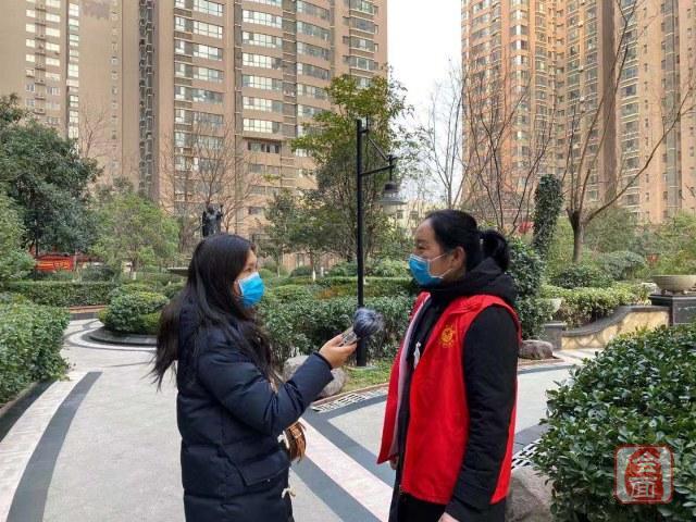△鄭州電臺新聞中心記者李欣潔在銀基王朝小區(qū)采訪未來路街道辦事處銀基花園社區(qū)黨支部書記常瑞英