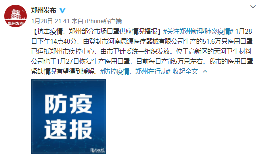 1月28日下午14點40分,由登封市河南思源醫(yī)療器械有限公司生產(chǎn)的51.6萬只醫(yī)用口罩已運抵鄭州市疾控中心,由市衛(wèi)計委統(tǒng)一組織發(fā)放。位于高新區(qū)的天河衛(wèi)生材料公司也于1月27日恢復(fù)生產(chǎn)醫(yī)用口罩,目前每日產(chǎn)能5萬只左右。我市的醫(yī)用口罩緊缺情況有望得到緩解。