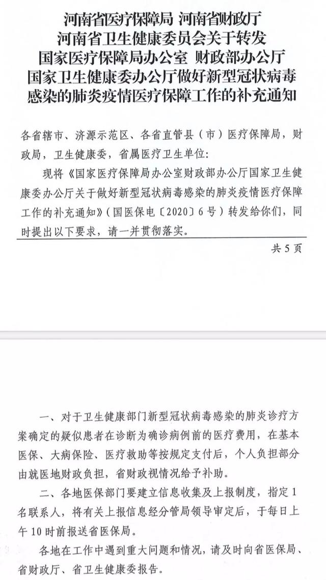 并要求河南省各省轄市、濟(jì)源示范區(qū)、各省直管縣(市)醫(yī)保局、財(cái)政局、衛(wèi)健委,省屬醫(yī)療衛(wèi)生單位,針對(duì)新型冠狀病毒感染的肺炎診療方案確定的疑似患者,在診斷為確診病例前的醫(yī)療費(fèi)用,在基本醫(yī)保、大病保險(xiǎn)、醫(yī)療救助等按規(guī)定支付后,個(gè)人負(fù)擔(dān)部分由就醫(yī)地財(cái)政負(fù)擔(dān),省財(cái)政視情況給予補(bǔ)助。