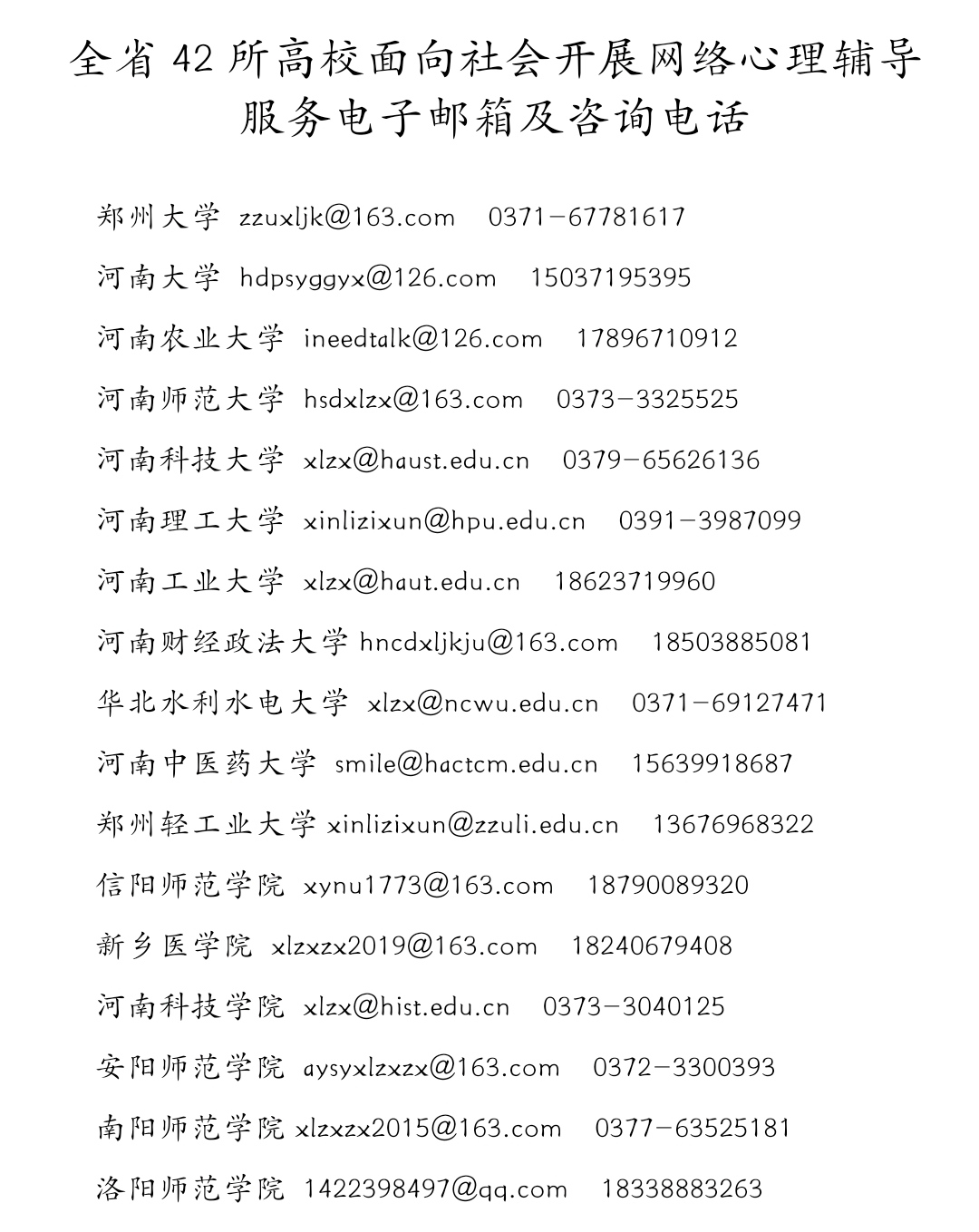 附:全省42所高校面向社會(huì)開展網(wǎng)絡(luò)心理輔導(dǎo)服務(wù)電子郵箱及咨詢電話