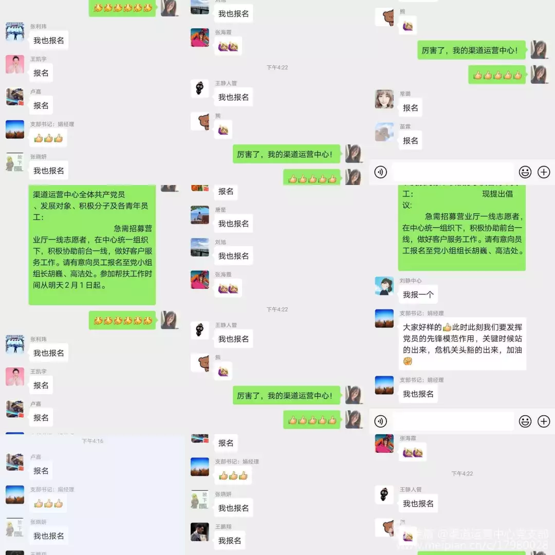 面對復(fù)雜的疫情,營業(yè)廳前臺一線的員工在勇?lián)蝿?wù)的同時,也承擔(dān)著沉重的心理壓力。當(dāng)?shù)弥碃I業(yè)廳員工可能因接觸疑似病例患者出現(xiàn)恐慌情緒,員工心理負擔(dān)過大時,河南移動鄭州分公司渠道運營中心支部委員首先站了出來,報名分包營業(yè)廳。支部全體黨員、積極分子爭相報名,為一線緩解了工作和心理上的重壓。渠道運營中心黨員突擊隊隊長胡巍率先沖在了生產(chǎn)第一線,為一線的同事加油打氣。到達營業(yè)廳之后他主動擔(dān)當(dāng)門廳導(dǎo)服,對每位進廳客戶進行體溫測量、人員信息登記、發(fā)放防疫宣傳資料等工作,為營業(yè)廳的安全運行把好第一個關(guān)卡。