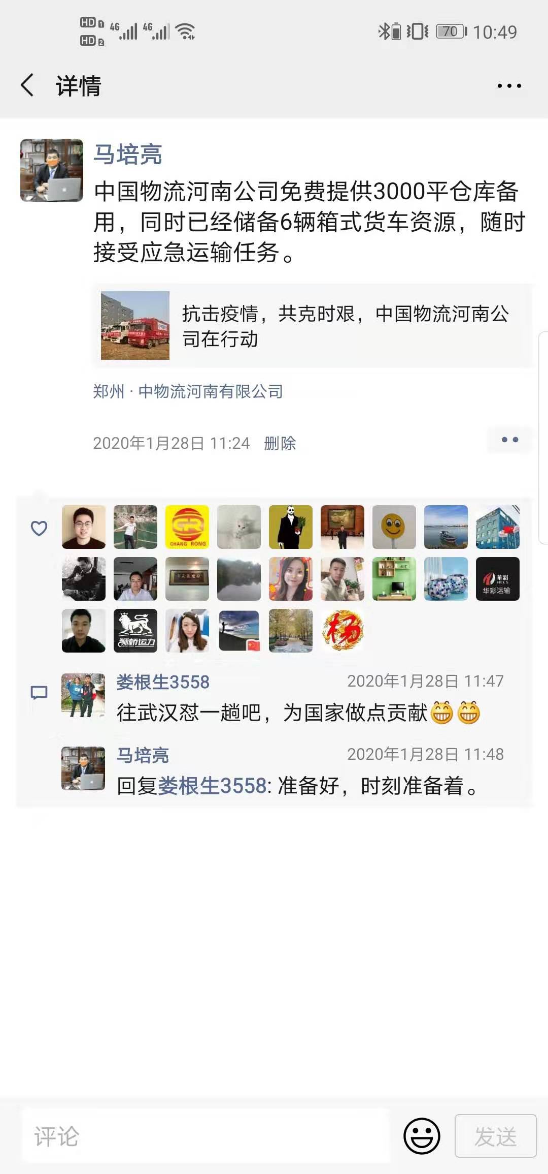 1月28日,中國物流河南公司供應鏈事業(yè)部經(jīng)理馬培亮在朋友圈里轉發(fā)了一篇《抗擊疫情,共克時艱,中國物流河南公司在行動》的文章,婁根生看到后,當即在文章下面跟評說:往武漢懟一趟吧,為國家做點貢獻!馬培亮回復他說:準備好,時刻準備著。
