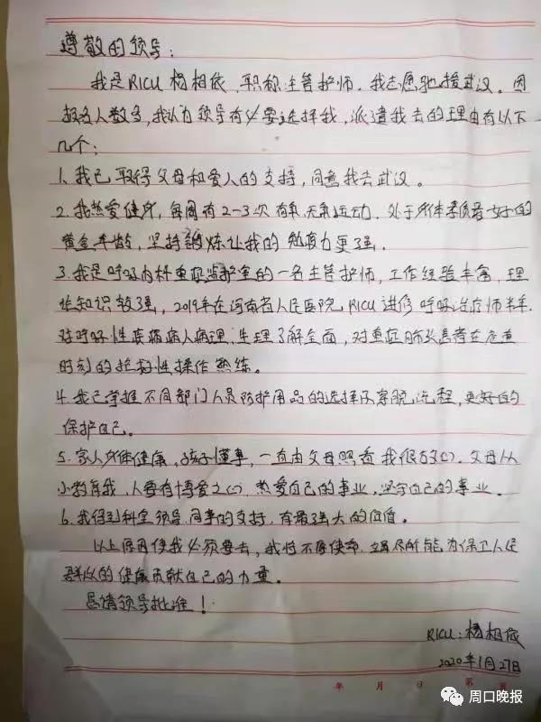 “尊敬的領(lǐng)導(dǎo):我是RICU楊相依,職稱主管護師,我志愿馳援武漢。因報名人數(shù)多,我認為領(lǐng)導(dǎo)有必要選擇我。派遣我去的理由有以下幾個……”1月27日,在得知醫(yī)院將組建援鄂第一梯隊后,29歲的楊相依主動向醫(yī)院領(lǐng)導(dǎo)申請加入。