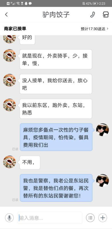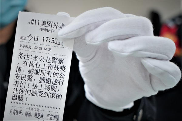 不一會兒,他就帶著“外賣湯圓”送到了鄭州東站派出所,100個湯圓被分成20小份送到派出所執(zhí)勤隊一線崗位。他說:“疫情發(fā)生以來,咱鄭州的公安民警堅守在一線崗位,守護著這一城人,因為你們無私的奉獻,才有了我們普通家庭的團圓。這湯圓雖然不貴重,但它是我這個普通河南老鄉(xiāng)對我們?nèi)嗣窬斓淖鹁矗M蠹艺泻艉米约?,一定不能一直干,不能倒下,因為你們都是家里的頂梁柱,一定不能出事,祝愿我們廣大民警節(jié)日快樂,闔家幸福。”
