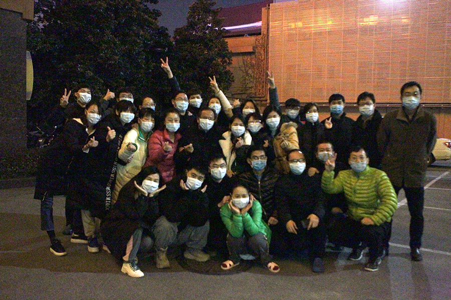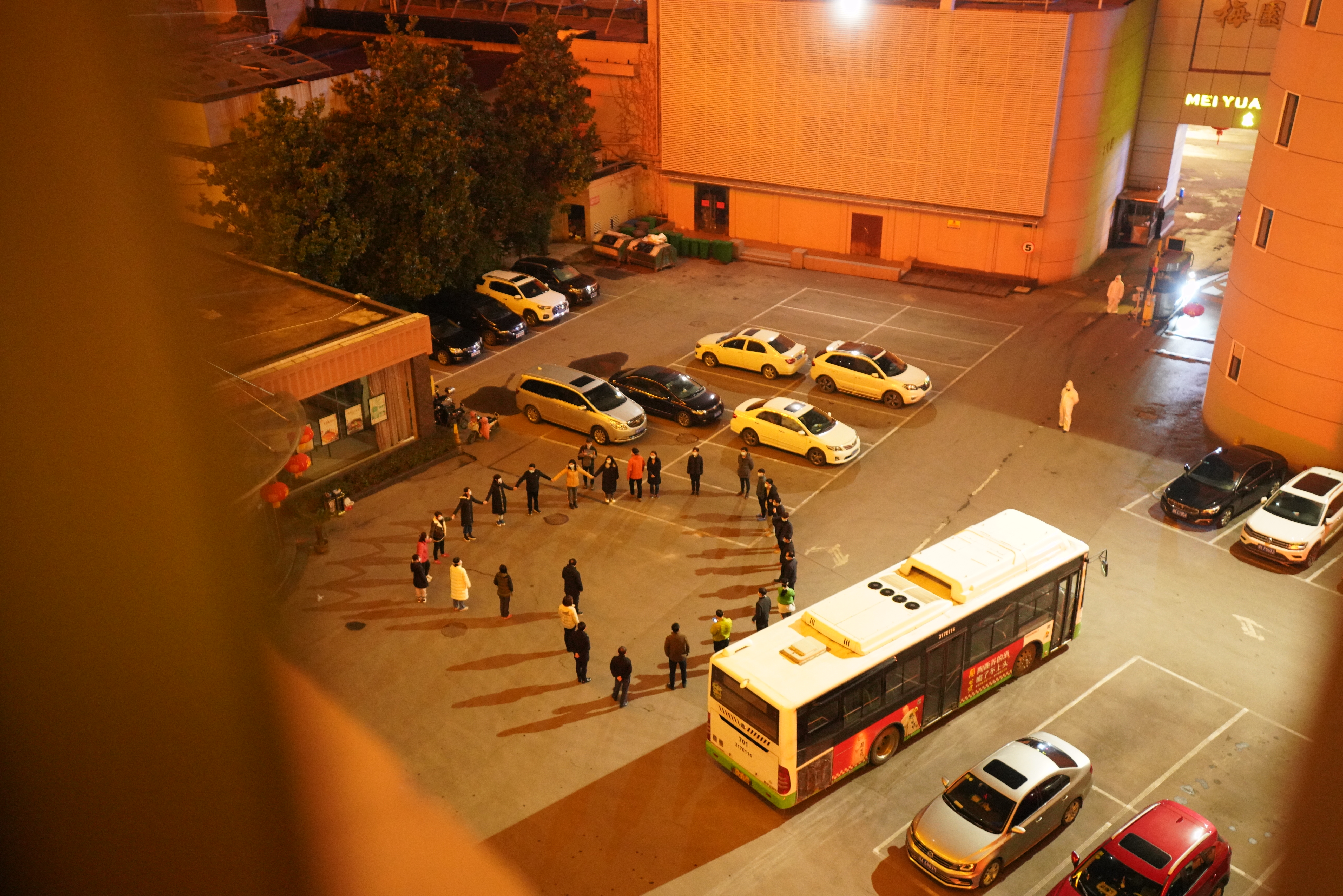 2月8日晚22:00,28名醫(yī)護人員在武漢梅園賓館的戶外停車,圍城一個心形圖案,為三名醫(yī)護人員舉行集體生日。