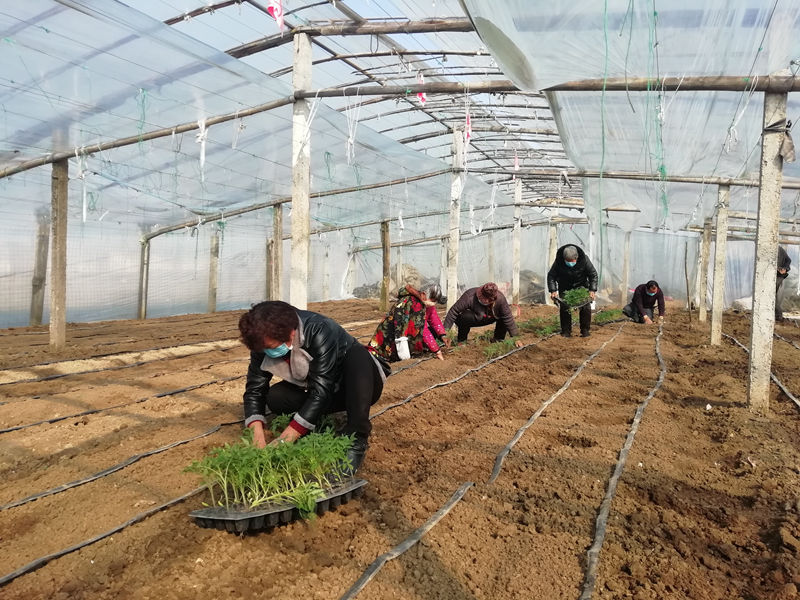 宋莊村村民正在大棚內(nèi)栽種番茄苗