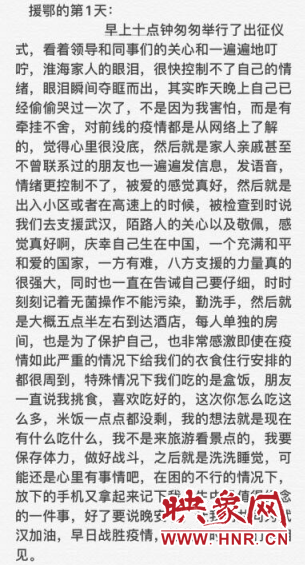 “我還是那個我,其實我只是換了套衣服,到了不一樣的地方做一樣的工作而已,也沒有那么偉大,17年前非典,我們不怕,因為我們是被保護的孩子;17年后,我們更不怕,因為我們已長大,渾身充滿力量,所以這次換我們來保護你們!”丁陽陽一直有寫日記的習(xí)慣,這是她在生日后寫下的隨筆,“讓我們?yōu)橐咔槠陂g奮斗在一線的90后年輕人吶喊加油,不忘初心,方得始終,做最好的自己!”帶著這樣的信念,丁陽陽這個年輕的“90后”護士像戰(zhàn)士一樣奮戰(zhàn)在“疫”線。她表示,自己不為當(dāng)英雄,但絕不做逃兵!