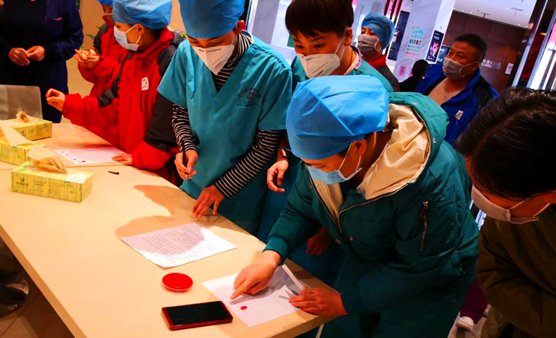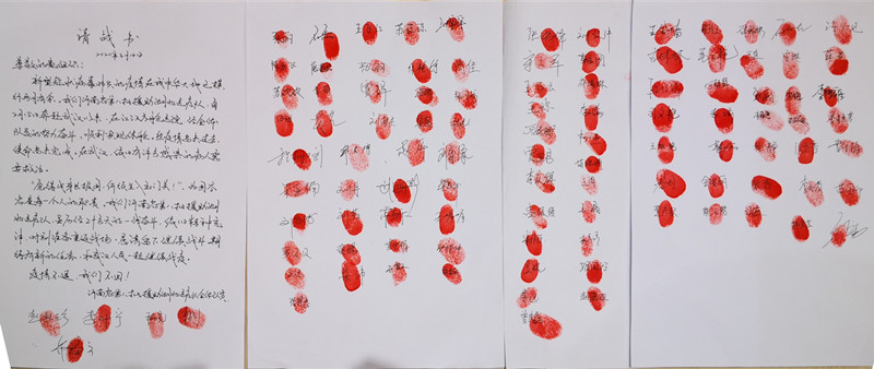 “愿得此身長報國,何須生入玉門關。為國盡忠,是每一個人的職責。河南省第八批支援湖北醫(yī)療隊隊員雖經(jīng)歷20多天一線奮斗,依舊精神充沛,時刻準備重返戰(zhàn)場,懇請留下繼續(xù)戰(zhàn)斗,期待有新的任務,和武漢人民一起戰(zhàn)斗。疫情不退,我們不回!”第八批醫(yī)療隊醫(yī)護人員們紛紛在請戰(zhàn)書上簽字,并按上手指印。
