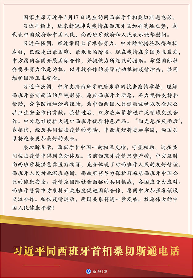 新華社北京3月17日電 國(guó)家主席習(xí)近平17日晚應(yīng)約同西班牙首相桑切斯通電話。