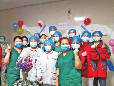 墻上掛滿了氣球,一件白色的隔離衣上寫滿了“戰(zhàn)友”們的簽名,桌子上擺滿了蛋糕、水果和巧克力。