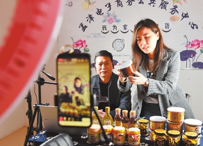 賣貨上“云端” 4月2日,孟津縣電子商務(wù)產(chǎn)業(yè)園網(wǎng)上平臺通過直播帶貨為農(nóng)戶推銷農(nóng)產(chǎn)品,把農(nóng)貨搬上“云端”。鄭占波攝