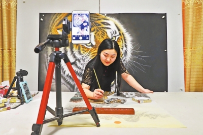 4月3日,民權(quán)縣北關(guān)鎮(zhèn)王公莊村農(nóng)民畫家王圓圓在直播繪畫。該村把“老虎畫”推上“云端”,每天有上千件畫作銷往全國各地。馬玉攝