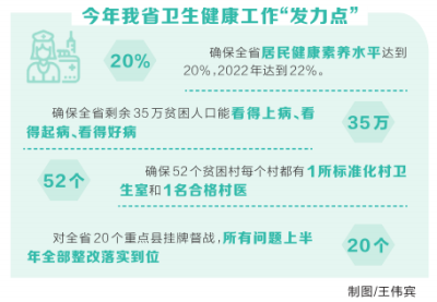 會(huì)議指出,今年要堅(jiān)持精準(zhǔn)施策,確保全省剩余35萬貧困人口能看得上病、看得起病、看得好病,確保52個(gè)貧困村每個(gè)村都有1所標(biāo)準(zhǔn)化村衛(wèi)生室和1名合格村醫(yī);加大督查力度,對(duì)全省20個(gè)重點(diǎn)縣掛牌督戰(zhàn),所有問題上半年全部整改落實(shí)到位;建立健康扶貧規(guī)范化標(biāo)準(zhǔn)化制度化長效機(jī)制,從源頭上預(yù)防因病致貧。