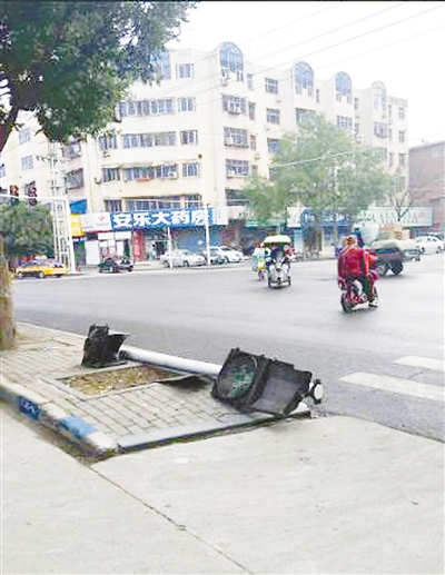 昨日上午9時(shí)許,記者趕到建設(shè)路與泰山路交叉口,看到路邊有個(gè)被撞倒的紅綠燈設(shè)備。