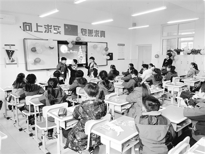 在教學(xué)樓二樓的三(1)班教室,記者看到教室內(nèi)被學(xué)生們用氣球裝扮起來,班里正在舉行活動。3位同學(xué)正在教室前方表演自己編排的話劇,幽默的臺詞和滑稽的動作,惹得班里的同學(xué)和老師哈哈大笑。