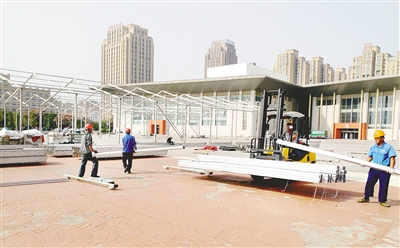 (記者 齊 放)10月22日下午,在市科教文化藝術中心廣場,幾十名安裝工人正忙碌著為即將到來的第十八屆中國(漯河)食品博覽會(以下簡稱食博會)搭建室外展棚。這預示著我市已正式進入了食博會時間。