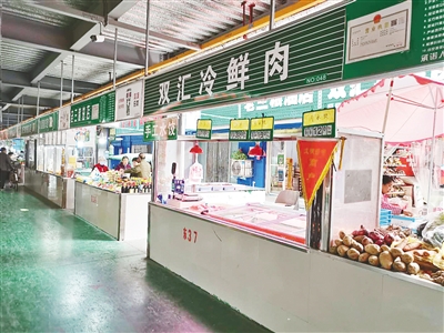 農(nóng)貿(mào)市場整潔有序,各商鋪采用統(tǒng)一門頭。