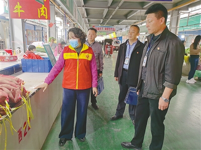 王斌(右)在溝張農(nóng)貿(mào)市場督導創(chuàng)文工作。