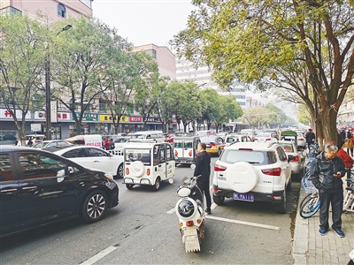 下午3時40分,記者在前往漯河育才學校的路上發(fā)現(xiàn)泰山路從遼河路口起往北出現(xiàn)大擁堵,機動車道兩側停滿了接學生放學的車輛,各種三輪車和自行車則占據(jù)了非機動車道。尤其是學校門前的機動車道兩側都只剩下一個車道通行,加上多路公交車通過,整條道路擁堵不堪。在學校大門前,記者未發(fā)現(xiàn)交警在現(xiàn)場指揮,未見管理道路交通的志愿者,只見多名身著志愿者服裝的家長志愿者和教師志愿者在維持學生隊伍秩序。